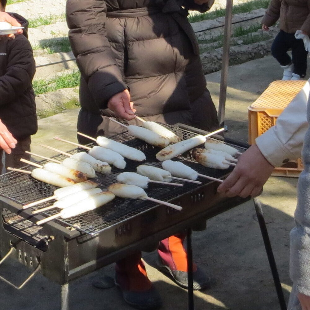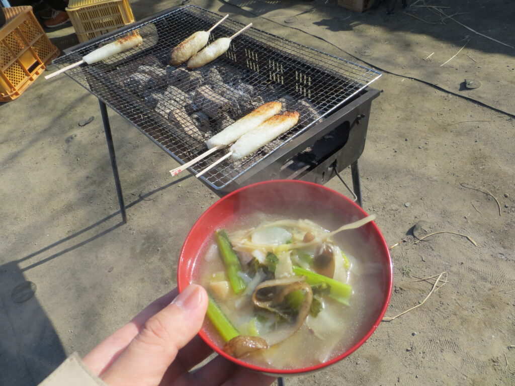 土鍋で炊いたアツアツご飯を袋に入れてつぶしたものを炭火で焼いてお出汁とともにいただきました!