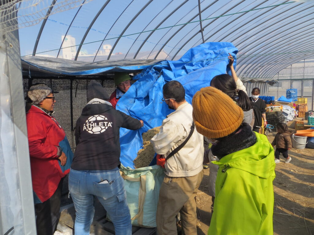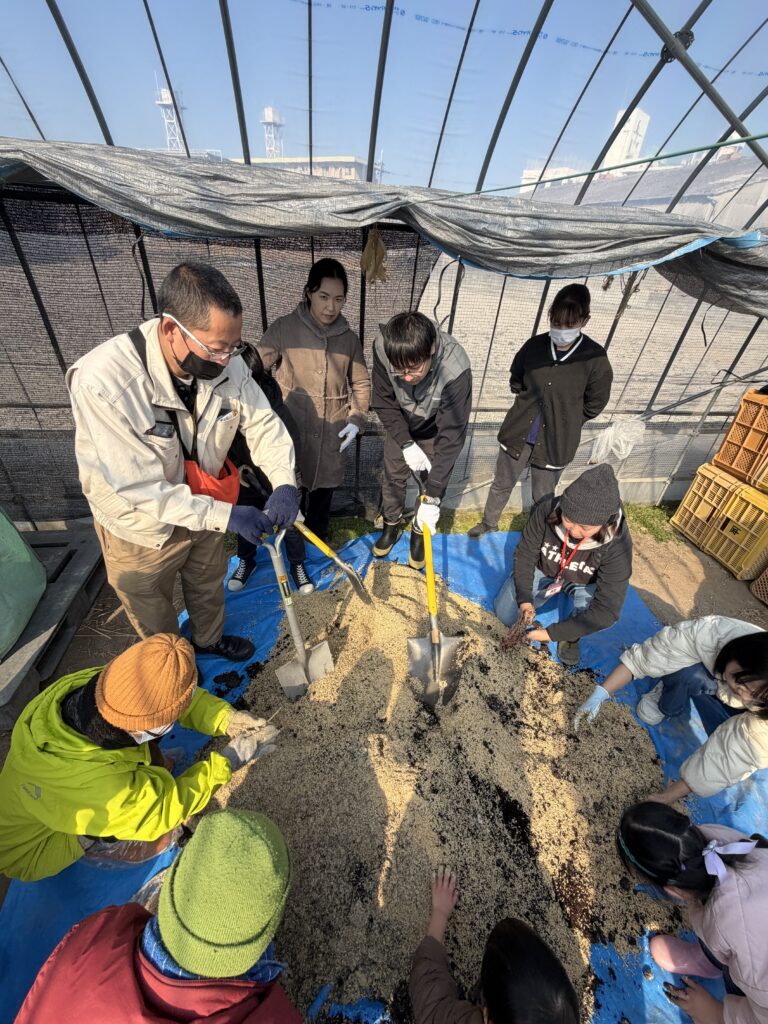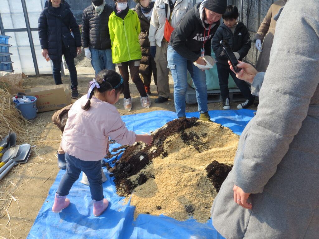 この日はもみ殻などを使った堆肥のブレンド作業を行いました。たくさんの量を作るのでみんなで協力してまぜまぜしました。