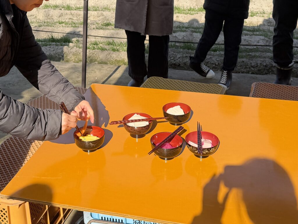 収穫したカラフルなお野菜たちはその場で調理していただき、生の状態の甘みやおいしさを堪能したのち、出来上がるまでの間にきりたんぽをみんなで作りました。
